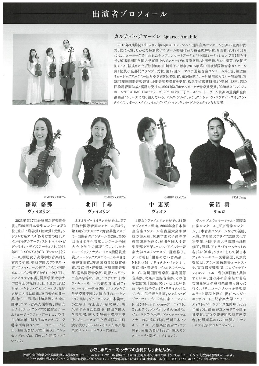 「宝山プレゼンツ カルテット・アマービレ」公演【当日券販売のお知らせ】 宝山ホール > お知らせ > 「宝山プレゼンツ カルテット・アマービレ」公演【当日券販売のお知らせ】 2026.02.10 いよいよ明日、2月11日(水・祝)「宝山プレゼンツ カルテット・アマービレ」の 公演日を迎えます。 明日は当日券を販売いたします。 2月11日(水・祝)12時(正午)から宝山ホール事務所にて販売いたします。 【当日券価格】 ・一般:4,500円 ・25歳以下:2,500円 実力派若手カルテットによる精巧なアンサンブルを是非ご堪能ください♪ 公演詳細はこちら クリックして拡大