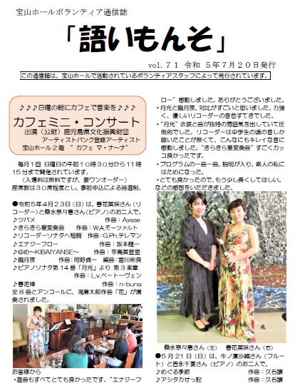 ボランティア通信「語いもんそ」Vol.71 宝山ホール > お知らせ > ボランティアスタッフ > ボランティア通信「語いもんそ」Vol.71 2023.11.02 令和5年7月20日発行 Vol.71(561KB/PDF)